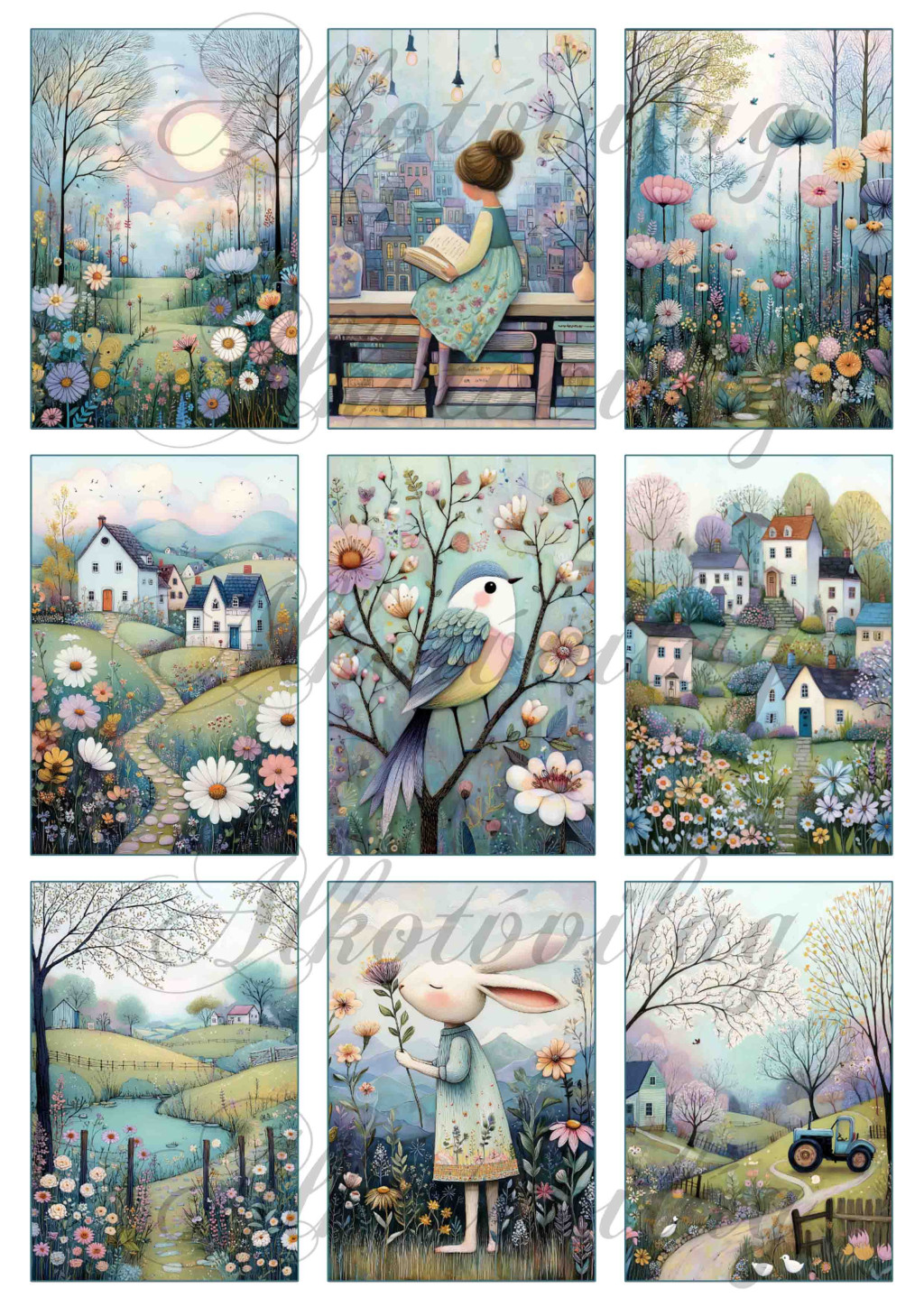 Kedves tavaszi hangulatú képek házikókkal, virágokkal - 9 x 6 cm - HŰTŐMÁGNES, AJÁNDÉKKÍSÉGŐ készítéshez