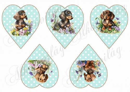 Cuki tacskó kutyusok virágokkal pöttyös szíveken - ZÖLD