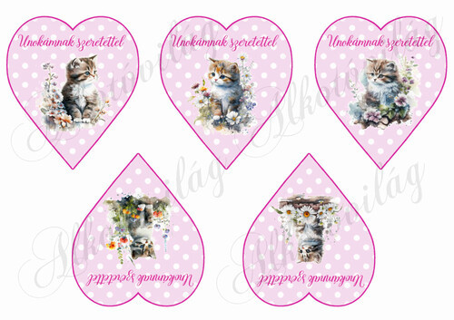 Cuki cicák virágokkal rózsaszín alapon fehér pöttyös szíveken - UNOKÁMNAK SZERETETTEL FELIRATAL