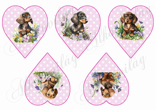 Cuki tacskó kutyusok virágokkal rózsaszín alapon fehér pöttyös szíveken - Több mint 20 alapanyagon elérhető.