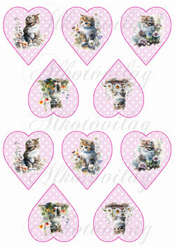 CUKI KÉZZEL FESTETT CICÁK VIRÁGOKKAL RÓZSASZÍN ALAPON FEHÉR PÖTTYÖS SZÍVEKEN - KICSIBEN - Több mint 20 alapanyagon elérhető.