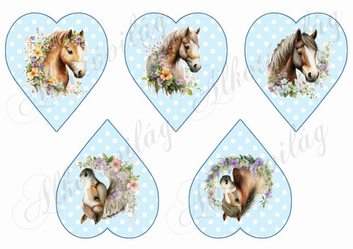 Lovak virágokkal kék alapon fehér pöttyös szíveken
