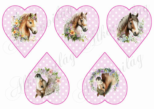 Lovak virágokkal rózsaszín alapon fehér pöttyös szíveken