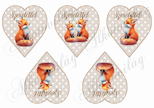 Cuki kézzel festett rókák drapp alapon fehér pöttyös szíveken - szeretettel felirattal - Több mint 20 alapanyagon elérhető.