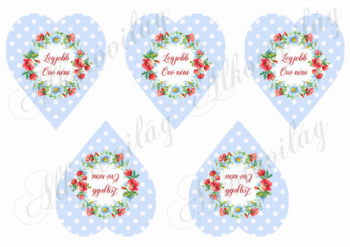 Kék alapon fehér pöttyös duci szívek pipacsos koszorúval - LEGJOBB ÓVÓ NÉNI felirattal - Több mint 20 alapanyagon elérhető.