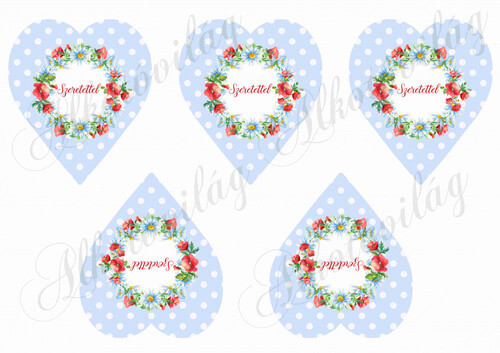 Kék alapon fehér pöttyös duci szívek pipacsos koszorúval - SZERETETTEL felirattal - Több mint 20 alapanyagon elérhető.