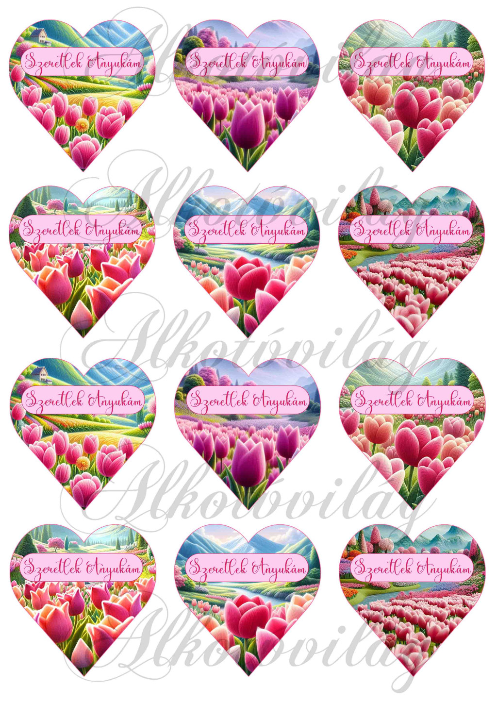 6,5 cm magas szívek pink-rózsaszín tulipános tájjal patchwork stílusban, gyapjú textúrával - SZERETLEK ANYUKÁM felirattal